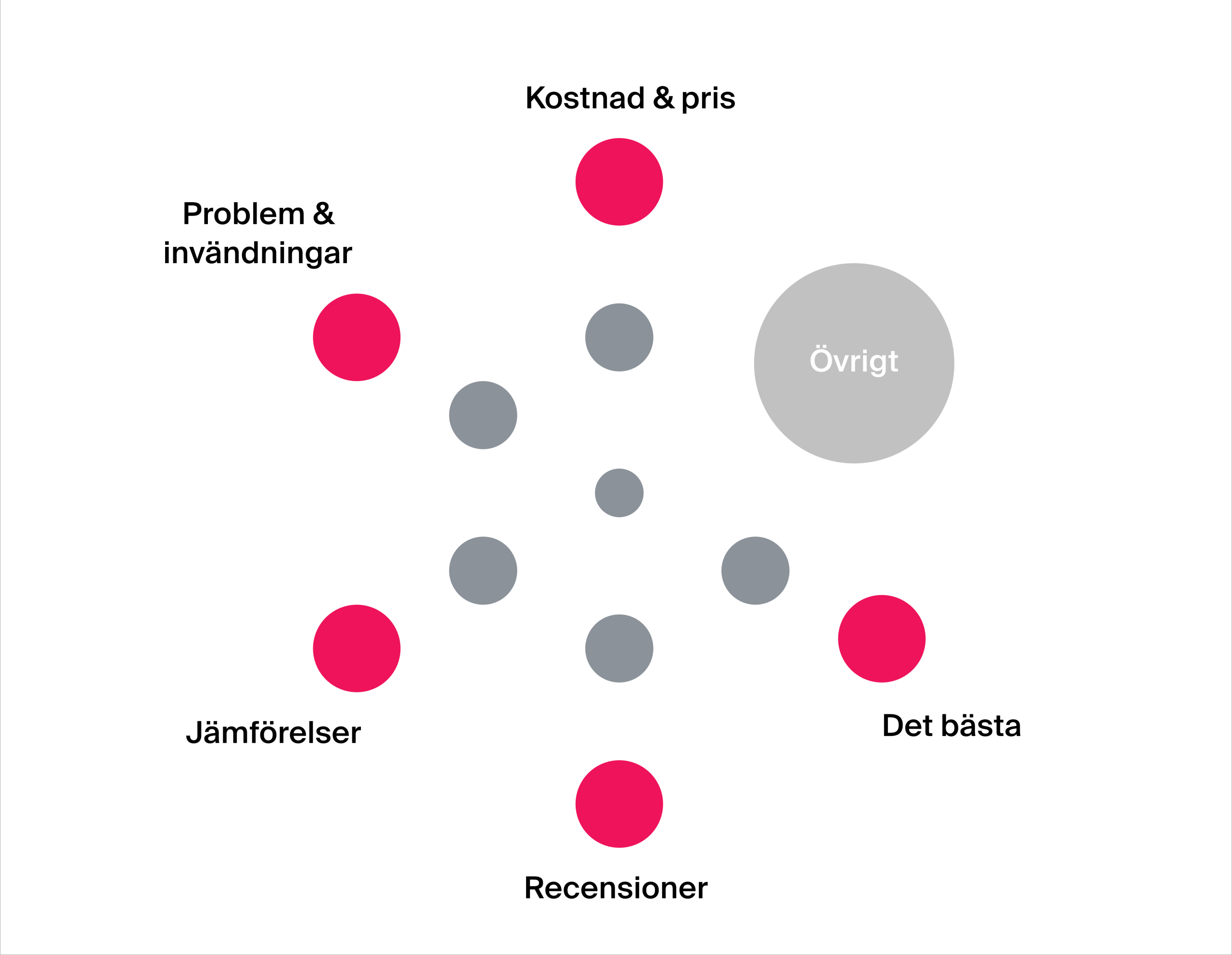 • Sätta kärnämnen för ert innehåll: Kartlägg de viktigaste frågor era köpare söker svar på. Ett bra startpaket är att bygga innehåll kring The Big 5 (pris, problem, jämförelser, recensioner och bästa-alternativ).